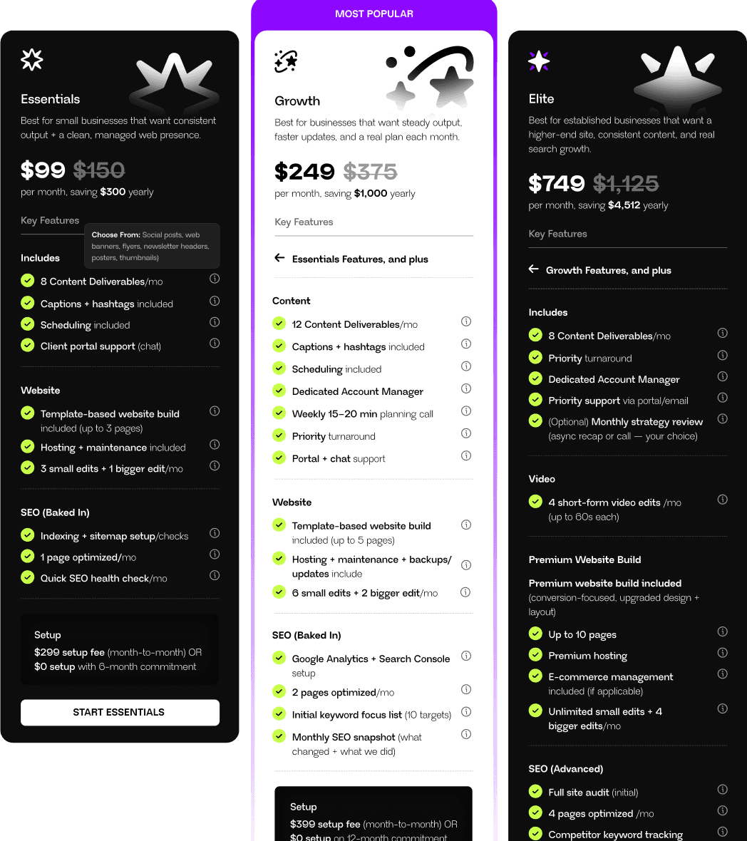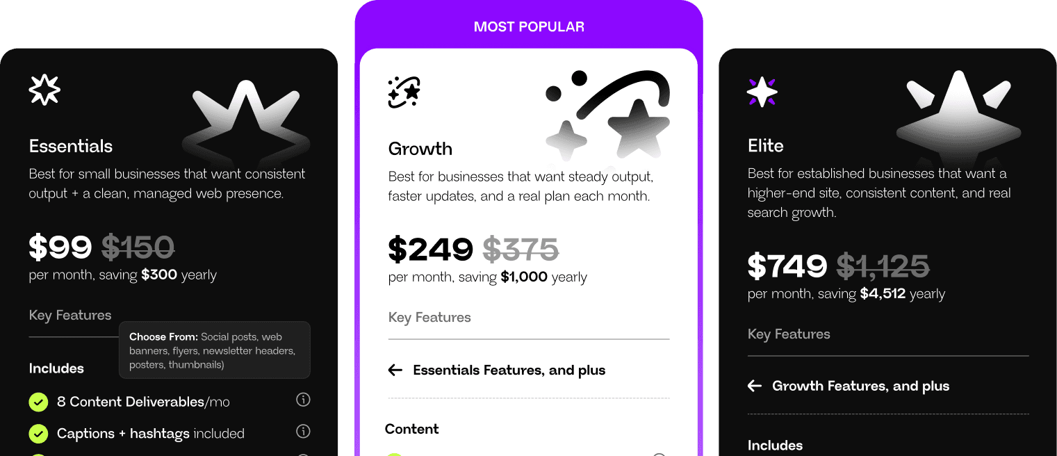 Juggling multiple email threads and chasing deadlines is a part-time job you didn't ask for. The Foundation Plan gives you a single, reliable production team that handles your core creative, from your website to your monthly content, all in one place.